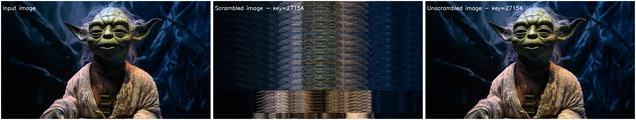 The video above is provided as an example. It has been encrypted according to the principle described here. You can download it by following this link . The C++/OpenCV program used to perform the encryption is also available by following this link. Another copy is available in the directory /home/jetson/Documents/NANOCODES/videoScramble/ on each Jetson Nano.